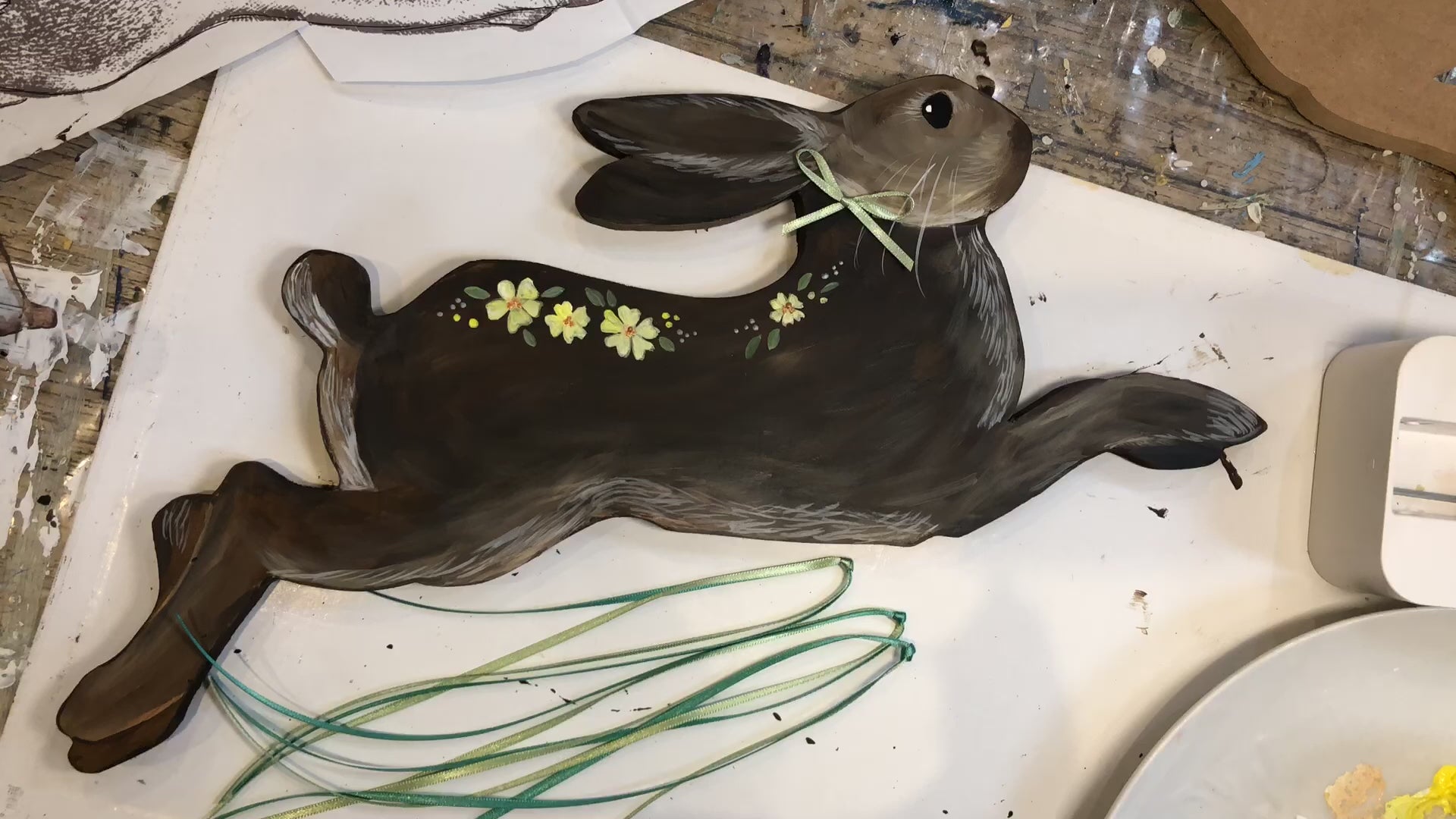 We will paint the hare in your choice of colours and flowers. Then embellish with ribbons and textures, use your imagination and let it run wild.